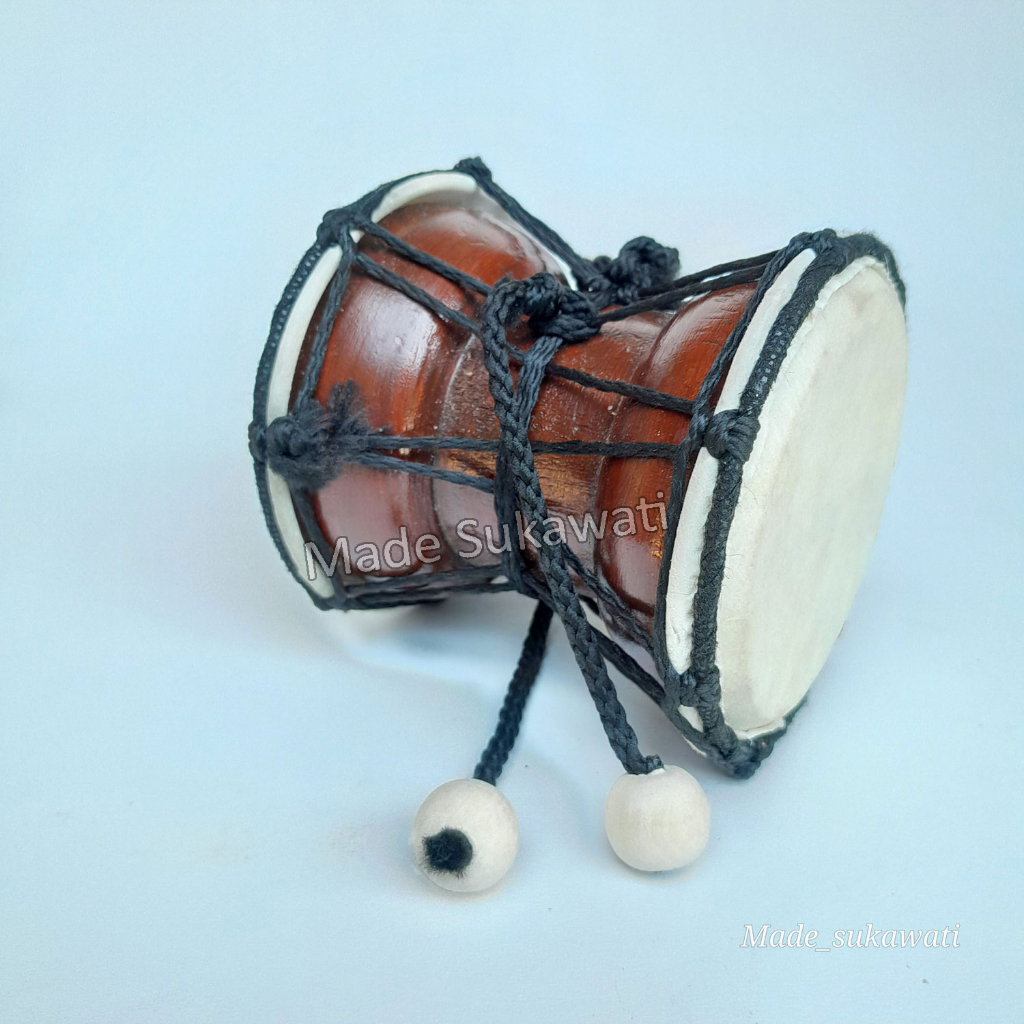 Ukuran diameter 9,5cm panjang 9,5cm, dimainkan dengan cara kocok diputar, bahan kayu kendang kulit,