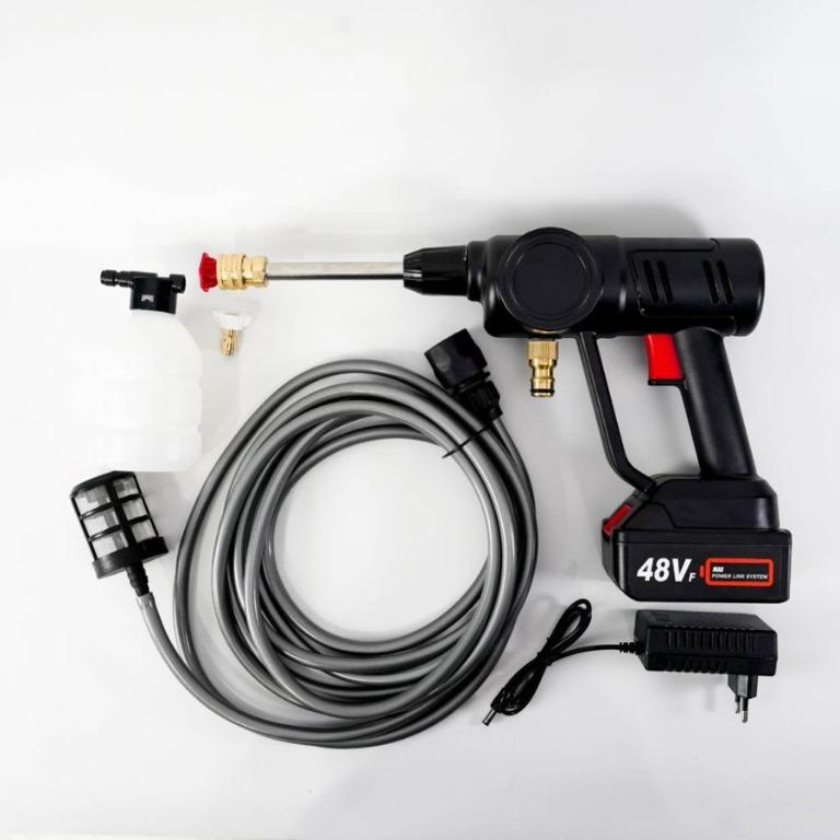 Spesifikasi: Warna hitam Bahan: ABS dan tembaga Tegangan: 488VF Daya: 600W Tegangan Pengisi Daya: AC 110-250V 47- 63Hz output 21vf-98vf 1A Panjang Selang Air: 5m Tegangan: 48VF Daya: 600W