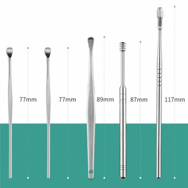 Satu set Pembersih telinga ini dapat memenuhi segala kebutuhan Anda dalam merawat dan membersihkan telinga Anda. Dengan bahan stainless steel, korekan kuping ini akan bisa tahan lama. Anda bisa dengan mudah memilih pembersih telinga yang mana yang cocok dengan telinga Anda karena ada 7 buah pembersih telinga dengan berbagai macam bentuknya. Dari kotoran telinga yang keras hingga yang lembek sekali pun bisa dibersihkan