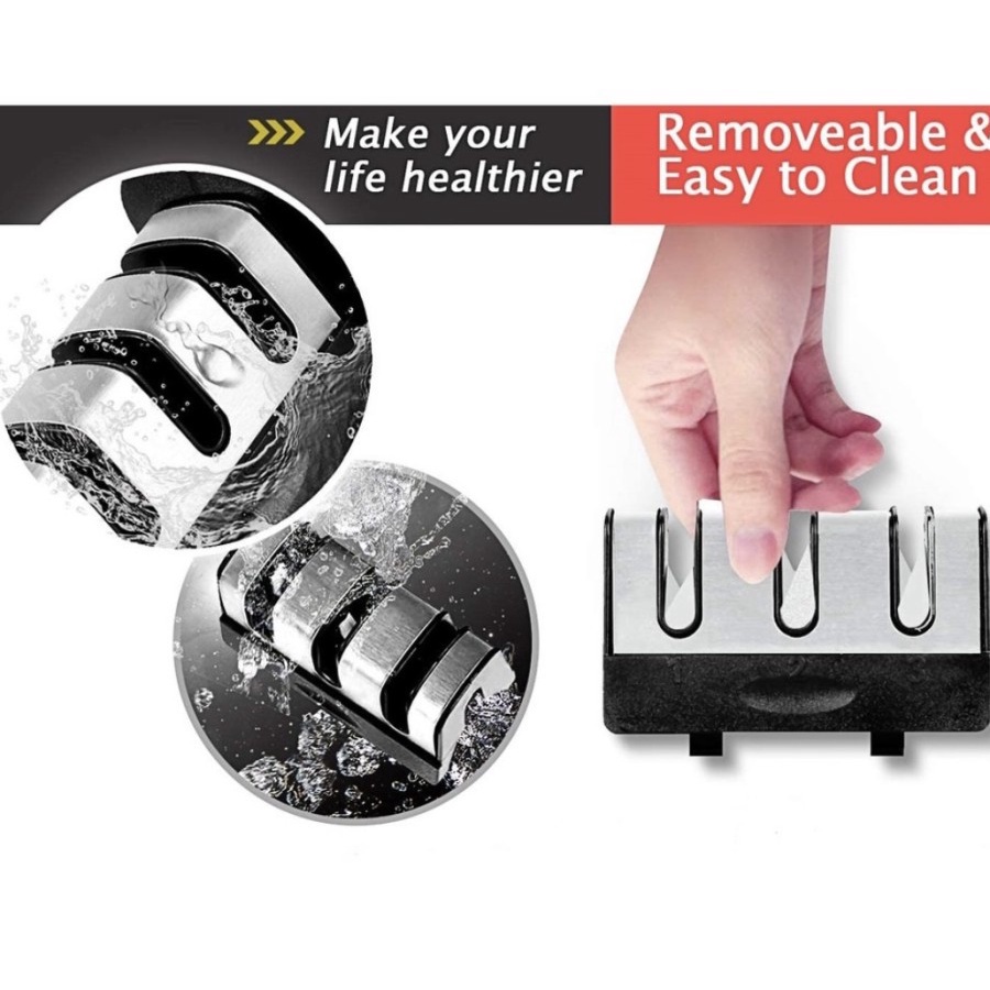 pengasah pisau super tajam super cepat Knife Sharpener Kitchen Knives fitur : 1 Desain dua tahap Asahan , baik kasar (digunakan untuk memperbaiki pisau yang rusak parah) dan halus (Ini merupakan langkah penting untuk menghilangkan Gerinda pada pisau, dianjurkan bahwa sekali seminggu atau penggunaan sehari-hari untuk menjaga pisau Anda tajam) 2 Desain asahan yang unik , nyaman saat digunakan untuk mengasah 3 Terbuat dari stainless steel ,kuat dan praktis 4 Memiliki pegangan sehingga aman saat digunakan.