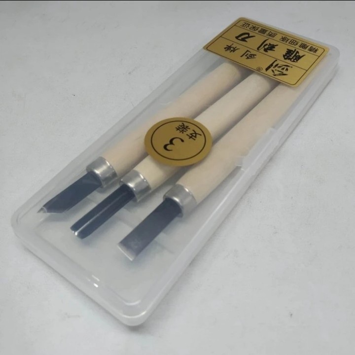 Detail Alat Pisau Pahat cungkil Ukir kayu Set 3pcs + kotak dramashop