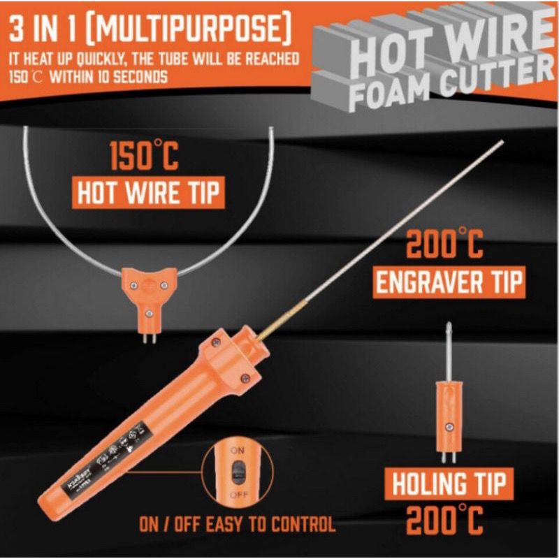 HOT WIRE FOAM CUTTER -untuk memotong, membentuk dan mendisign gabus / styrofoam, alat ini cocok sekali dan banyak digunakan untuk membuat model huruf, gambar dsb Terdiri dari 3 macam kepala potong : - kawat panas - kepala ukir - pisau panas