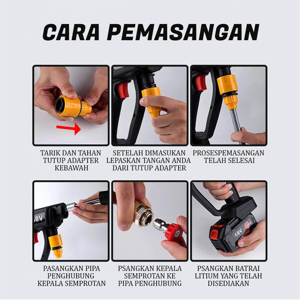 Ukuran Dimensi XCJ-1 Tegangan: 198Vf Panjang : 40 cm lebar : 30 cm tinggi : 13 cm Ukuran Dimensi XCJ-2 Tegangan: 480Vf Panjang : 40 cm lebar : 30 cm tinggi : 13 cm Spesifikasi produk: Baterai: 10000mAh (Anda dapat menggunakan 20-30 menit sekaligus) Tekanan mak : 90 bar Panjang selang:5 m Volume air : 2.4L Dimensi : 35x20cm 3 metode injeksi: injeksi langsung / injeksi difusi / injeksi busa Kemasan produk: 1 koper 1 semprotan air pencuci mobil bertekanan tinggi 1 selang 1 saringan air 1 tiang panjang 2 nozel 1 baterai 1 adaptor daya