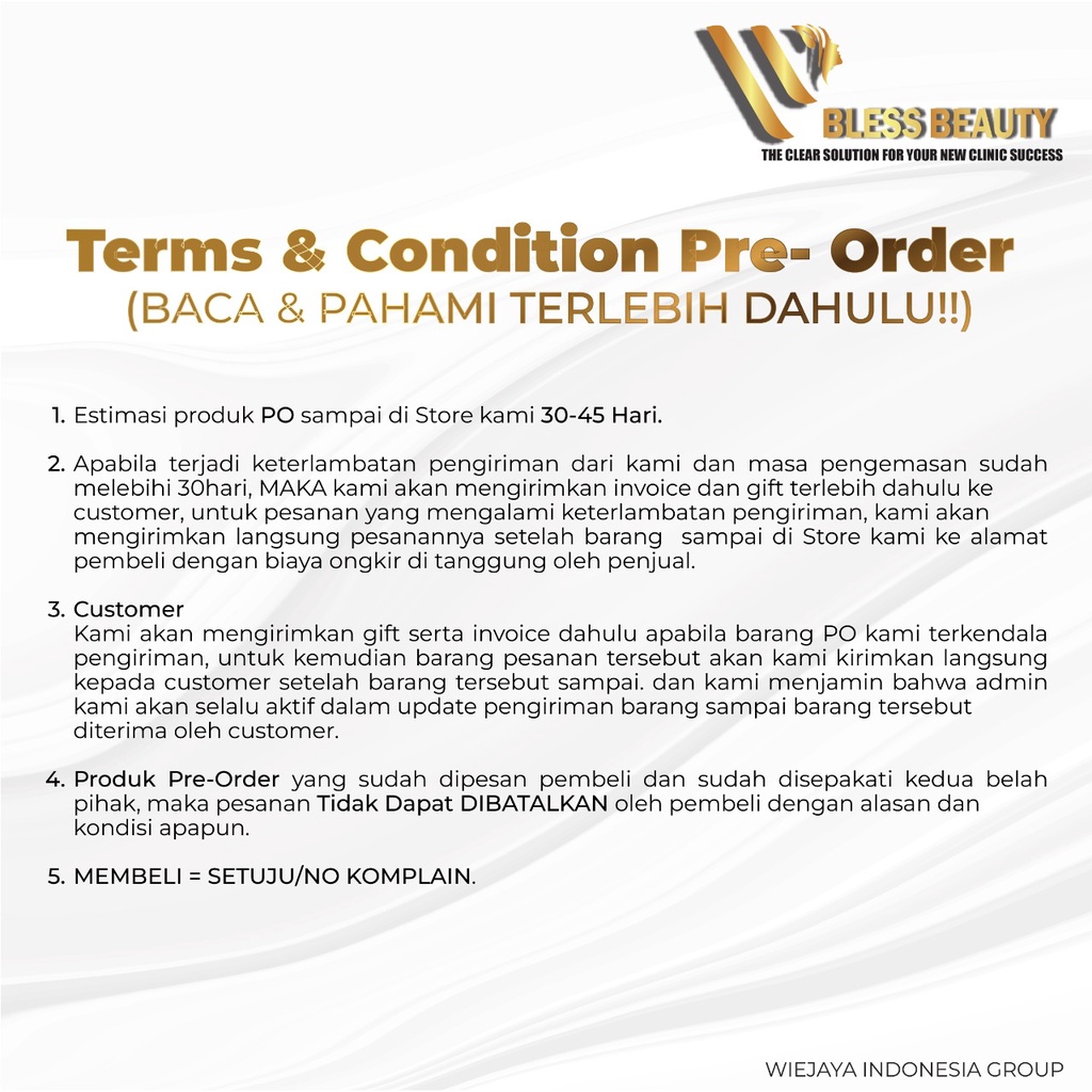 4. Produk Pre-Order yang sudah dipesan pembeli dan sudah disepakati kedua belah pihak, maka pesanan tidak dapat DIBATALKAN oleh pembeli dengan alasan dan kondisi apapun.