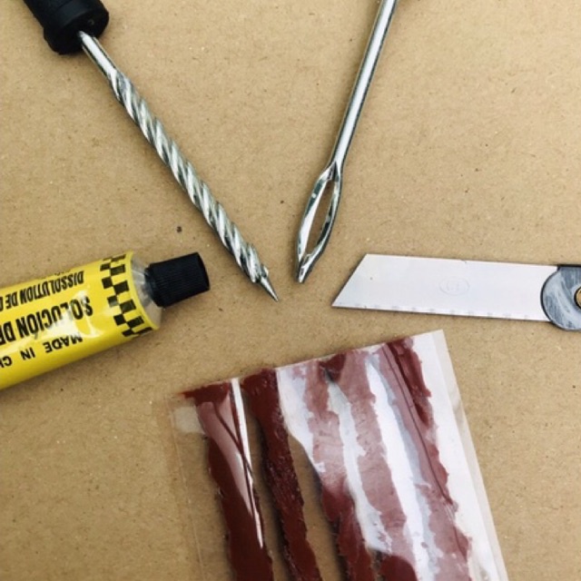 1 set (Kikir AlatTubeless KaretCacing Lem PisauCutter) Alat untuk menambal ban bocor. Mudah digunakan, bisa dilakukan sendiri, untuk pertolongan pertama. Cocok untuk disediakan pada setiap mobil atau sepeda motor, untuk menambal ban dalam kondisi darurat. Untuk menambal, bersihkan roda dari kotoran yang menempel, lalu bersihkan lubang dengan kikir yang tersedia. Masukkan karet penambal pada alat penjepit. Tusukkan ke dalam ban. Lalu tarik keluar. Potong karet yang lebih.