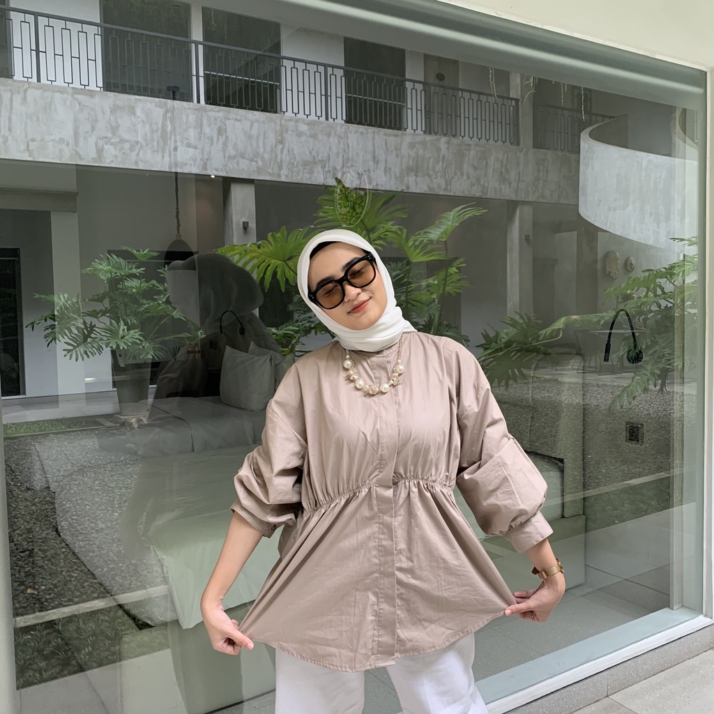 Basic shirt yang didesain dengan detail uniq yaitu kerutan di bagian depan ( belakang loose ) full kancing tertutup dan lengan semi ballon.