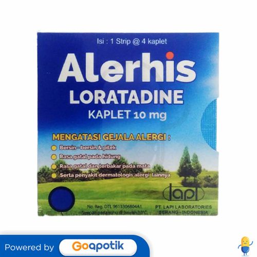 Deskripsi : PENGGUNAAN OBAT INI HARUS SESUAI PETUNJUK DOKTER. Alerhis digunakan untuk meredakan kondisi yang disebabkan karena alergi. | Komposisi : Tiap tablet mengandung Loratadine 10 mg | Dosis : ATURAN PAKAI HARUS SESUAI DENGAN PETUNJUK DOKTER. Dewasa dan diatas 12 tahun: 10 mg sekali sehari atau 5 mg dua kali sehari. Anak-anak 2-12 tahun: berat badan dibawah 30 kg 5 mg, sekali sehari, diatas 30 kg 10 mg sekali sehari. | Indikasi : Digunakan untuk meredakan kondisi yang disebabkan karena alergi. | Perhatian Khusus : Jangan berikan obat ini pada anak di bawah 2 tahun, ibu hamil dan menyusui, gangguan hati dan ginjal. | Kemasan : AMPLOP @ 1 STRIP @ 4 KAPLET | NIE : DTL9613306804A1