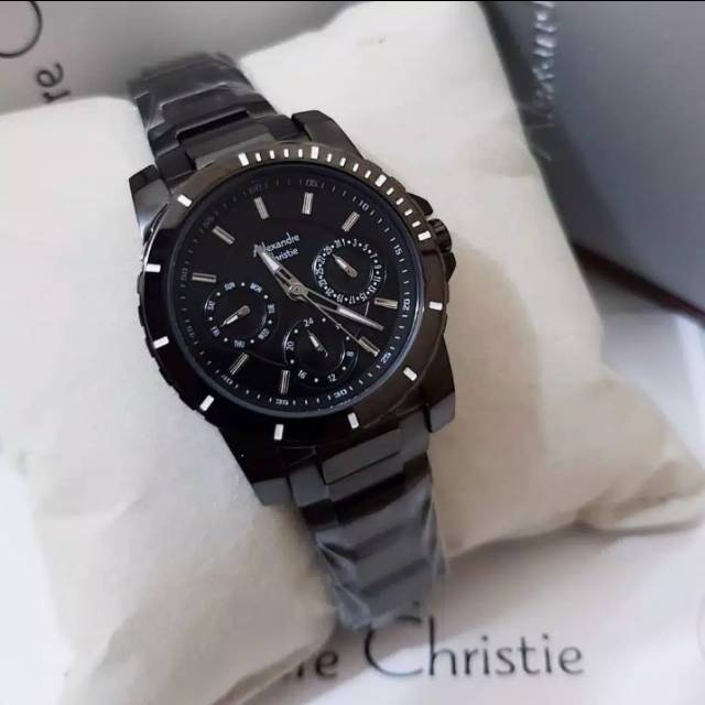 merk. : Alexandre Christie tipe. : 6141 kualitas : all Stainless stell warna. : Silver black, full black jenis. : Wanita water resist 5 atm strep. : rantai jam. : Analog + multifungsi + tanggal + tanggal + hari + am/pm size. : 3,4cm jenis mesin : baterai Garansi resm mesin : 1 tahun