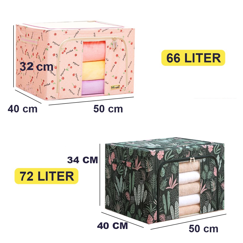 Storage Box Double zipper large adalah tempat penyimpanan baju serbaguna dengan kapasitas 66 Liter, fungsinya untuk tempat menyimpan pakaian atau mainan anak-anak, agar bebas dari debu dan lebih rapi Uniknya, Storage box ini terdapat 2 pintu, bisa buka dari atas dan samping. bahan kain oxfrod