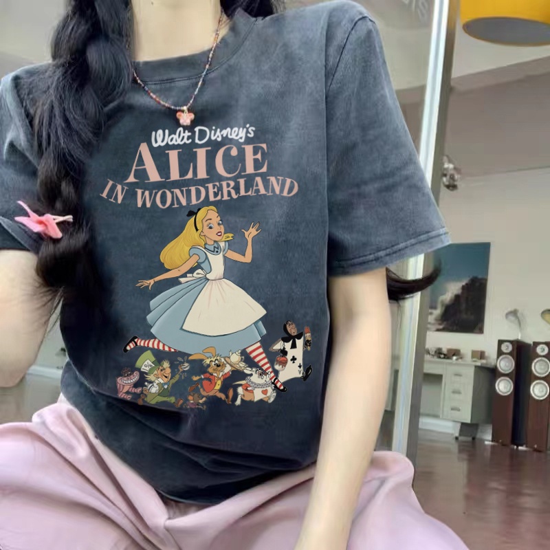 Detail "ALICE" T shirt Hitam Washed Baju Wanita Kaos Lengan Pendek Korean Style Graphic Tee 004