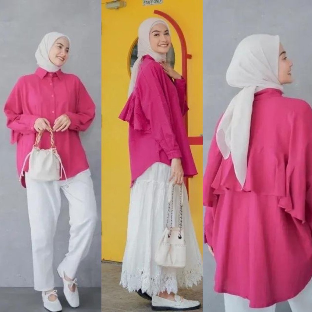 Pakaian Wanita > Atasan > Kemeja & Blouse > Alika shirt - Basic Kemeja Wanita Oversize aksen Ruffle Belakang / kemeja big size lengan panjang wanita / atasan korean style wanita / atasan kemeja wanita / top ruffle wanita / kemeja ruffle wanita / kemeja ruffle belakang / atasan wanita kekinian