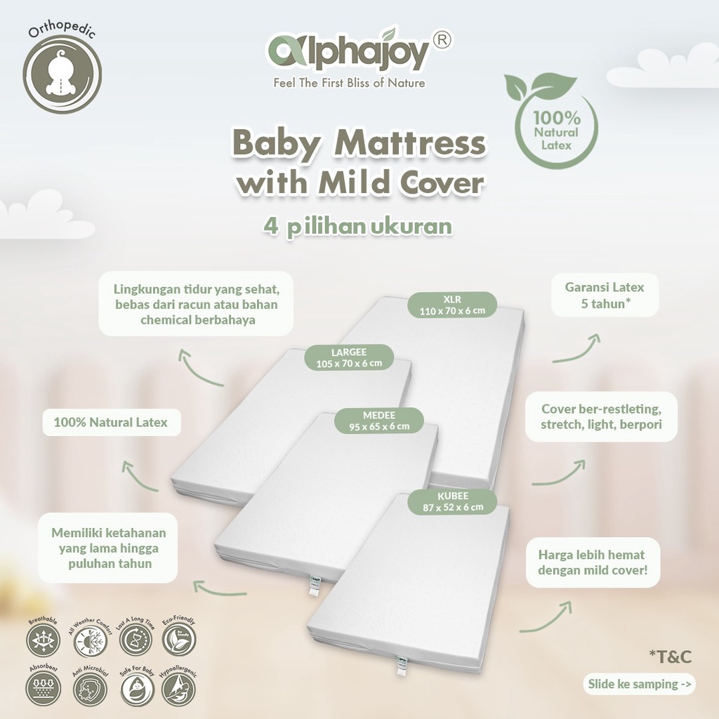 Selain nyaman dan lembut Alphajoy Baby Mattress memiliki keunggulan alami; Breathable, Hypoallergenic, Anti-microbial, Anti Dust mite, Orthopedic dan Eco-Friendly. Good investment product 100% lateks alami diketahui memiliki ketahanan yg lama hingga puluhan tahun.