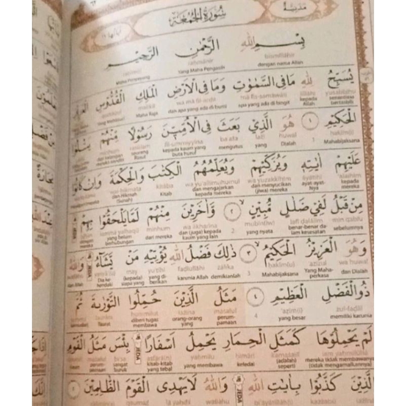 Keistimewaan : 1. Terjemah Standar Depag RI perkata agar dapat memahami ayat-ayat yang dipelajari 2. Transliterasi latin terpisah mempermudah membaca Al Qur'an dengan kalimat latin bahasa Indonesia 3. Tanda waqaf Jeda dan Go yang diperjelas membaca secara tartil 4. Blok warna tematik menjelaskan tema-tema Al Qur'an di setiap halaman secara lengkap 5. Rasm Usmani Standar Indonesia 6. Desain Cover modern dan elegan