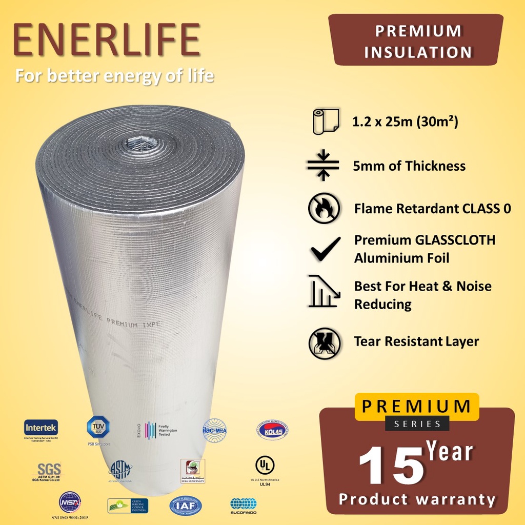 ENERLIFE PREMIUM SERIES (P-5A1GC) - Tebal : 5 mm - Aluminium Foil GLASSCLOTH + IXPE Foam WITH FLAME RETARDANT + Aluminium Foil - Lebar : 1,2 meter - Panjang : 25 meter - Luas 30m²