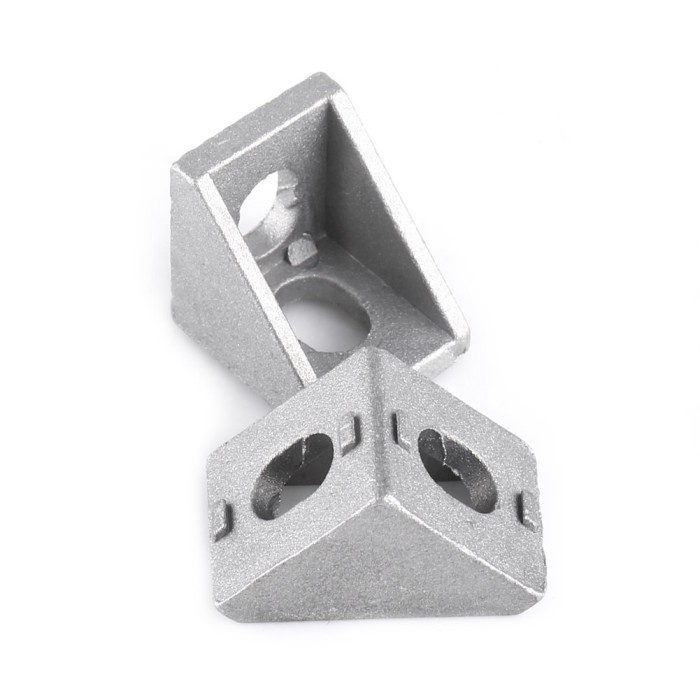 - High quality 2 hole corner bracket right angle 20Series aluminum brackets for aluminum extrusion profile with slot 6mm. - Made from high quality aluminum material for good rust resistance and better performance,high hardness and a long service life. - Rigid connection, used to connect pieces of 20mm aluminum extrusion at a 90 degree angle. - Dimension: 20*20*17mm;Suitable for most of metric 20 Series aluminum extrusion.