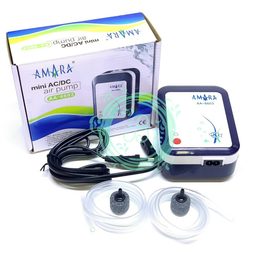 Amara AC/DC AA-6603 merupakan pompa udara atau aerator mini otomatis untuk aquarium, hidroponik, aquaponik maupun aquascape. Pompa ini sangat cocok untuk Anda yang sering mengalami pemadalam lampu. Pompa akan tetap beroperasi dan menyala secara otomatis (emergency air pump) pada saat mati lampu, sehingga tidak akan memberikan dampak buruk bagi ikan ataupun tanaman hidroponik Anda.