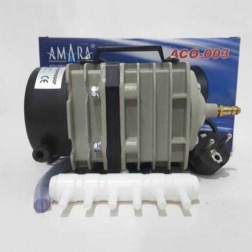Amara Electric Magnetic Air Compressor ACO-003 220-240V hemat listrik hanya 32W menghasilkan output besar output 60liter/menit (cukup untuk menyuplai akuarium/kolam 200-500liter), besar tekanan (pressure) : 0,02mpa / 3psi / 0.2bar *1 outlet udara : percabangan dengan tambahan adapter dapat disesuai dengan kebutuhan 6 cabang. bisa digunakan untuk 6 - 10 akuarium ukuran sedang (25 liter). *bisa dijadikan blower, peniup udara untuk kasur angin-balon-dll, peniu/pembersih debu, dll *body alumunium dpt menahan getaran, suara lebih halus dibanding body plastik
