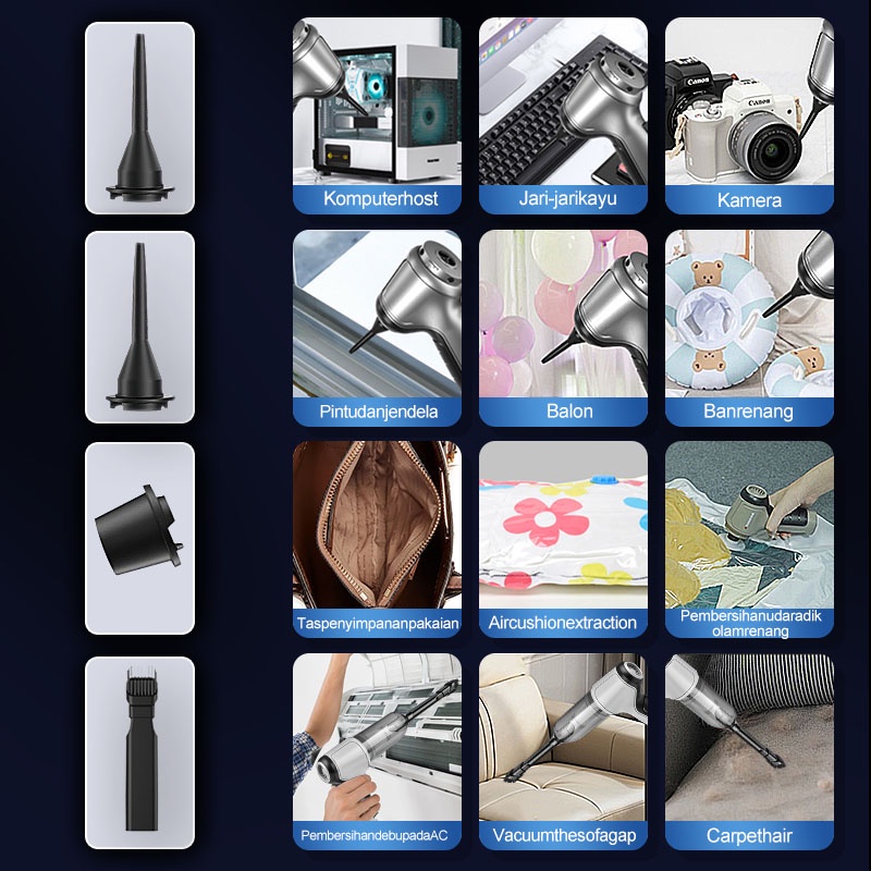 📦Paket termasuk: ☑ 1x penyedot debu ☑ 1x nosel ekstraksi udara multi-fungsi ☑ 1x kepala hisap panjang ☑ 1x kepala sikat ☑ 1x kepala peniup jelaga ☑ 1x kabel pengisian daya USB ☑ 1x Deskripsi
