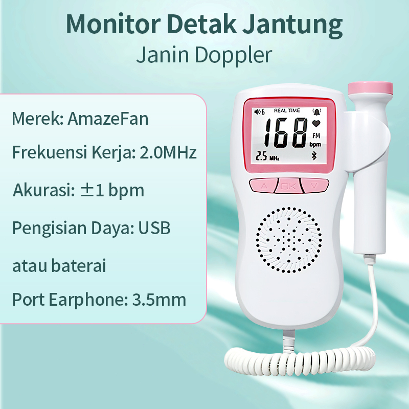 π Spesifikasi Produk β’ Jenis alat: Alat Doppler Detak Jantung Janin β’ Merek: AmazeFan β’ Frekuensi kerja: 2.0MHz β’ Ketepatan: Β±1bpm β’ Pengisian daya USB/Baterai β’ Jack earphone: 3.5mm