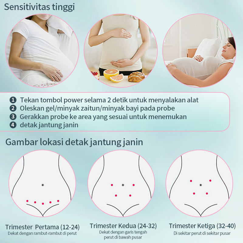 π Cara Penggunaan yang Mudah β’ Tekan dan tahan tombol power selama lebih dari 2 detik untuk menghidupkan alat β’ Oleskan gel/ minyak zaitun/minyak bayi pada sensor β’ Pindahkan sensor ke lokasi yang tepat untuk mencari detak jantung bayi
