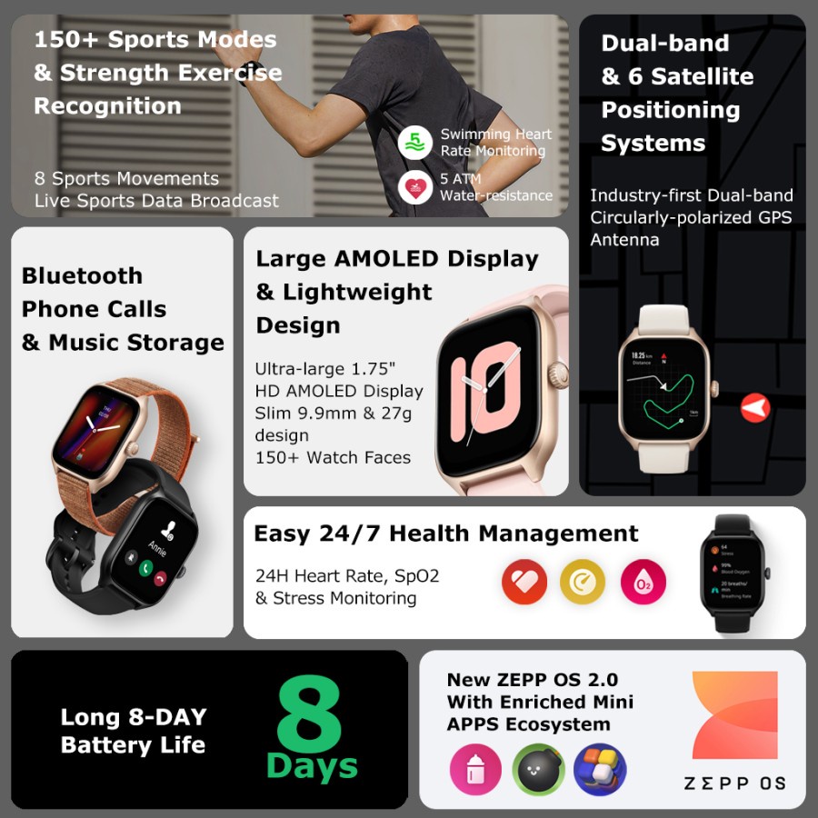 Layar AMOLED HD 1,75 inci yang besar, Desain ramping 9,9mm dan Ringan 27g. Layar Ultra-besar 1,75” HD AMOLED memberikan pengalaman visual yang mendalam dan jernih dengan rasio layar-ke-tubuh yang tinggi dan 341 ppi, dan dapat dilihat kapan saja dengan layar yang selalu aktif. Bodi 9.1mm ultra tipis dan ringan 27g.