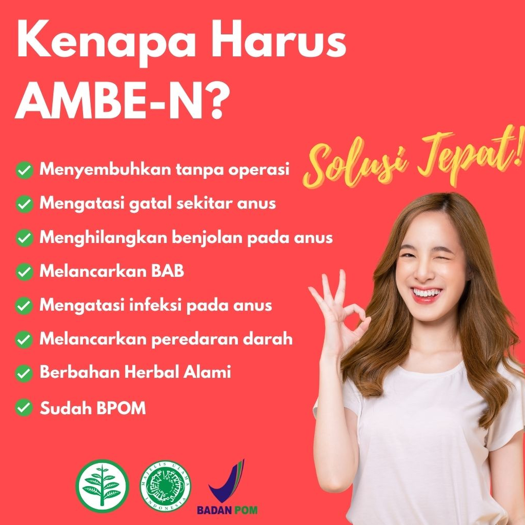 Manfaat AMBE-N -Mencegah peradangan, agar tidak terjadi pembengkakan -Mengencerkan kotoran dan melancarkan saluran BAB -Mengurangi nyeri dan gatal pada area anus -Melancarkan haid/menstruasi -Sebagai peluruh urin