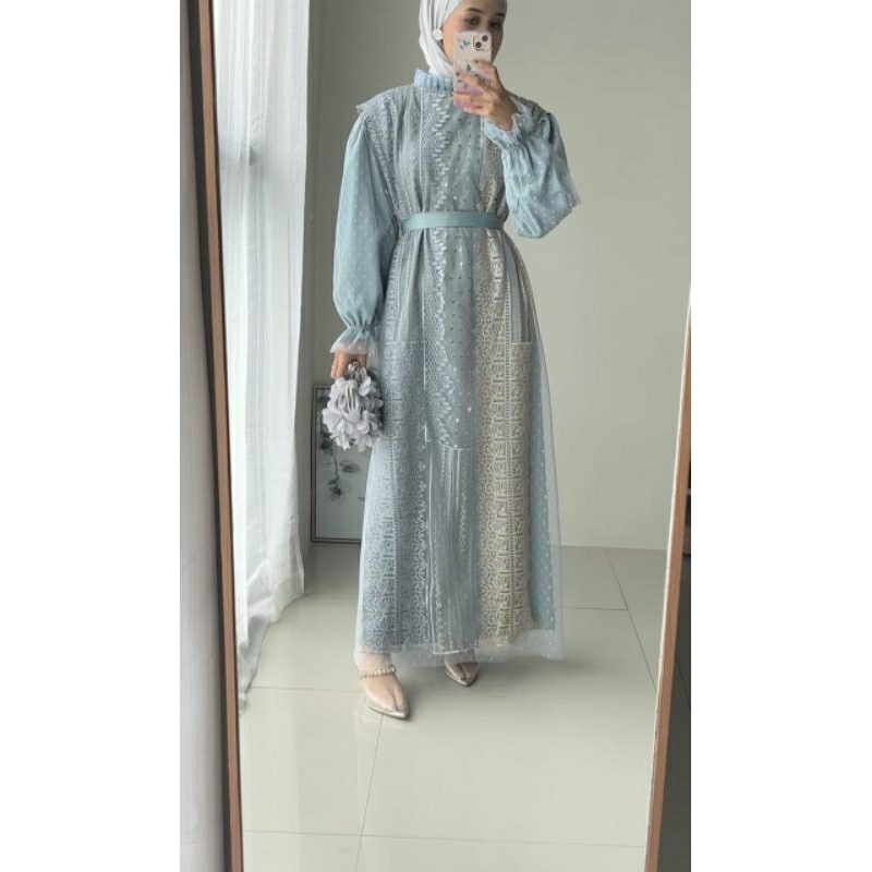 AMEERA DRESS . Dress Ameera Bahan Roberto Cavali Premium ini super adem, halus, lembut, tidak gampang kusut dan pastinya tidak nerawang dengan warna Ice Blue mix tile dan brukat bikin penampilan kamu makin cantik dan cute nih Girls, yang pastinya super mewah. . Detail Ukuran : WARNA ICE BLUE : - M : LD 102cm, Panjang Dress 130cm, Panjang Tangan 54cm - L : LD 105cm, Panjang Dress 133cm, Panjang Tangan 56cm . WARNA ALMOND - L : LD 105cm, Panjang Dress 136cm, Panjang Tangan 60cm. . Detail Produk : - Bagian tangan karet - Ruffle dibagian kerah (khusus warna ice blue) - Tali terpisah yg bisa diatur utk menyesuaikan bentuk badan.