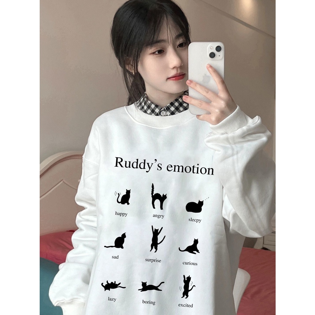 Pakaian Wanita > Hoodie & Sweatshirt > Sweatshirt > American retro kucing lucu cetak pullover sweater wanita musim gugur dan musim dingin pasang nasional merek longgar kapas tebal jaket bulu