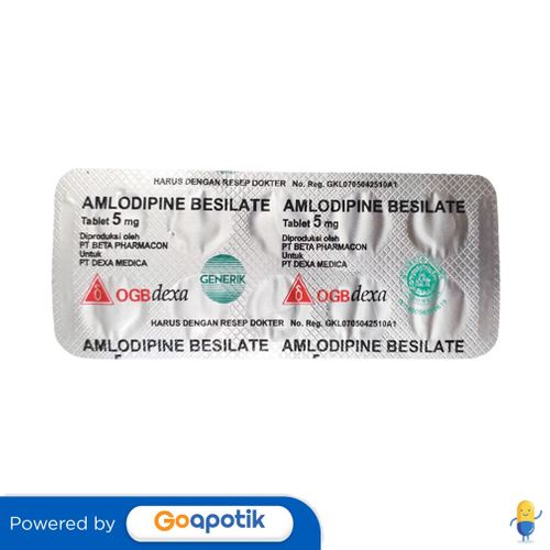 Deskripsi : PENGGUNAAN OBAT INI HARUS SESUAI PETUNJUK DOKTER. Digunakan untuk pengobatan hipertensi (tekanan darah tinggi), angina stabil kronik, pengobatan pasien yang pasti atau diduga menderita angina vasospastik (angina varian) | Komposisi : Tiap tablet mengandung amlodipine besylate 5 mg | Dosis : ATURAN PAKAI HARUS SESUAI DENGAN PETUNJUK DOKTER. Dewasa: 5 mg sekali sehari. Dosis bersifat individual dan dapat ditingkatkan setelah setidaknya 1-2 minggu. MaksImal 10 mg sekali sehari; Anak-anak 6-17 tahun: 2,5 mg sekali sehari, dapat meningkat menjadi 5 mg sekali sehari setelah interval 4 minggu sesuai dengan respons klinis. Lansia: 2,5 mg sekali sehari. | Indikasi : Digunakan sebagai terapi angina stabil kronis, hipertensi, angina Prinzmetal. | Perhatian Khusus : Pasien dengan stenosis aorta, gagal jantung, kardiomiopati hipertrofi, kerusakan hati, lansia, anak-anak, ibu hamil dan menyusui. | Kemasan : Strip 10 tablet | NIE : GKL0705042510A1