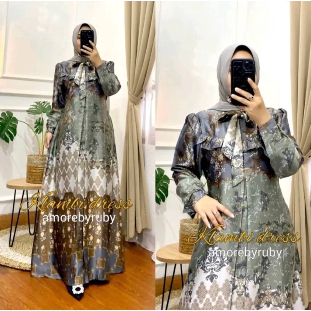 Amoreby Klambi Dress Wanita DiorSilk Gamis Terbaru Lengan Karet Panjang Maxidress Kerah Dasi Kekinian LD 110 cm