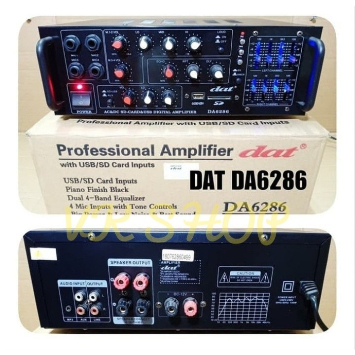 Ampli dat da6286 power amplifier karaoke mixer equalizer da 6286 DAT DA6286 DIGITAL KARAUKE AMPLIFIER with usb, mmc card dan aux line 4 input microphone tone musik vol ,bass, treble slector dvd / usb,bt tone vol mic, low, mid, hi, echo ,rpt, dly slector eq equalizer 4 bands kiri dan kanan slector loud output dan input line rca input 2 buah 1 set speaker input power dc 12v bisa speaker pasif 10 inch 2 buah cocok untuk 8 inch dimensi 36*33*18:6000= 3.564