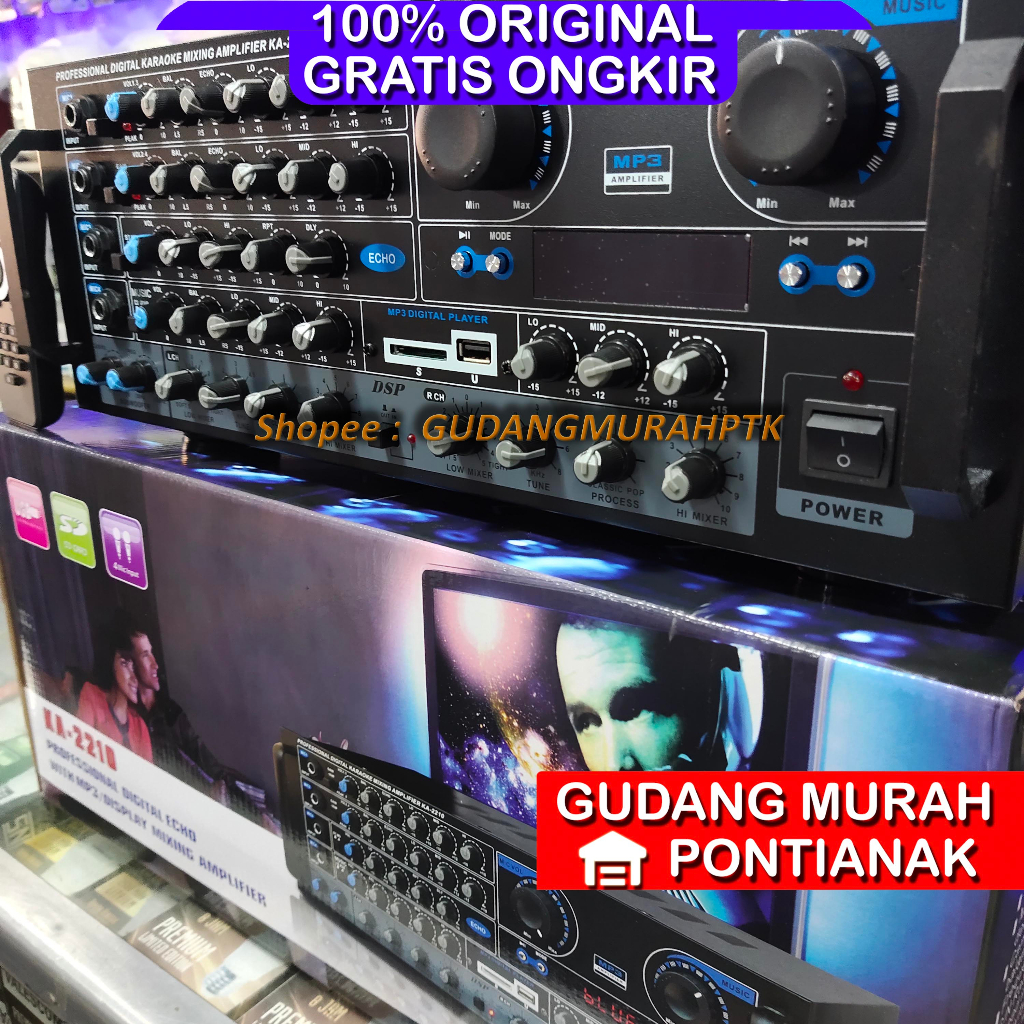 AMPLI KARAOKE BLACK SPIDER KA-2210 PLUS BBE/ PROSESOR PROFESSIONAL DIGITAL MIXING AMPLIFIER Spesifikasi - Bluetooth,USB,SD card MP3 Player & FM radio FEATURE 4 input mic jack akai 4 channel input mic tone mic : vol, echo, low, mid, high effect mic tone : vol, rpt, del sub woofer control vol, frequecy master volume : music dan mic with USB, MMC card, line in, bluetooth control channel speaker balance : low mx, tone, process, himix selector effect : in dan out selector mp3 dan dvd music control tone : vol, bal, low, mid, hi switch power on dan off fun cooling 1 line in 3 line output 4 channel output speaker pasif output power 600Watt 8ohm frequncy responce 20hz-20khz thd 1.5% power input ac 240 v / 50hz