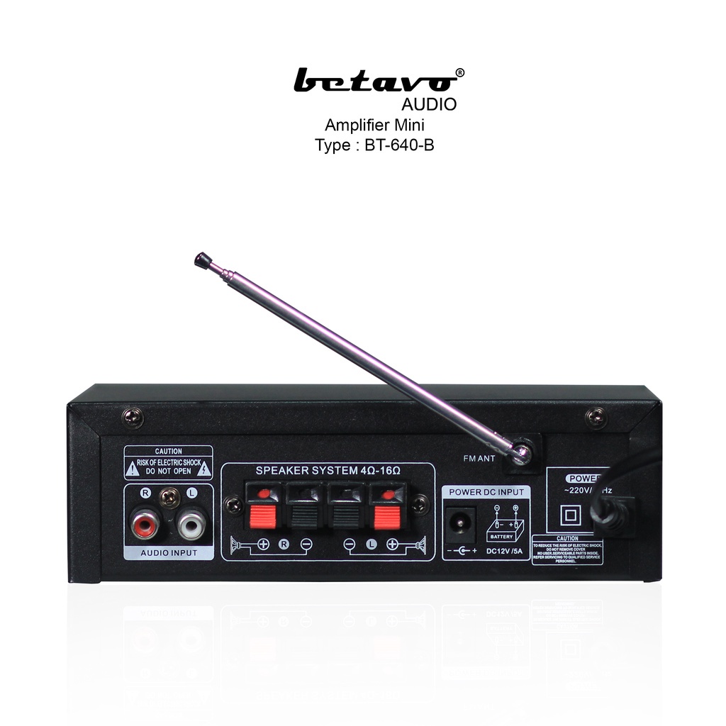 Spesifikasi : BT-640 B Ampli Mini - Power Output RMS : 18 Watt - Bluetooth, USB, SD/MMC Card - Speaker Impedance 4 - 16 ohm - S/N Ratio : -90dbn - Input power : 12 V / 5 A - AC 220V - 240 V / 50Hz - 60Hz - Input Impedance : 47k - Frequency : 20Hz - 20kHz - Input Sensitivity : 0.25mV - 220mV - Nett Weight : 1.00 Kg - Gross Weight : 1.07 Kg - Packing Size : 6.5*19*19 Cm