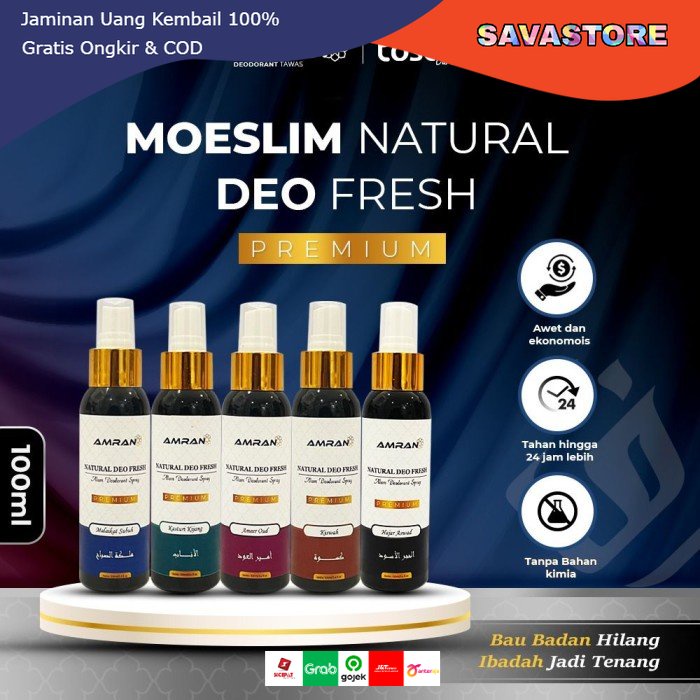 AMRAN Natural Deo Fresh Premium merupakan deodorant 100% berbahan alami, aman untuk kulit dengan aroma islami khas timur tengah yang menyegarkan dan mampu memberikan kesegaran pada ketiak Anda dalam beraktivitas. Cocok dipakai untuk segala aktivitas di luar ruangan dan menambah kekhusyukan dalam beribadah. Tinggal semprotkan setelah mandi, dijamin bau badan hilang dan tahan hingga 24 jam, penggunaan sangat praktis dengan packaging yang mudah dibawa.
