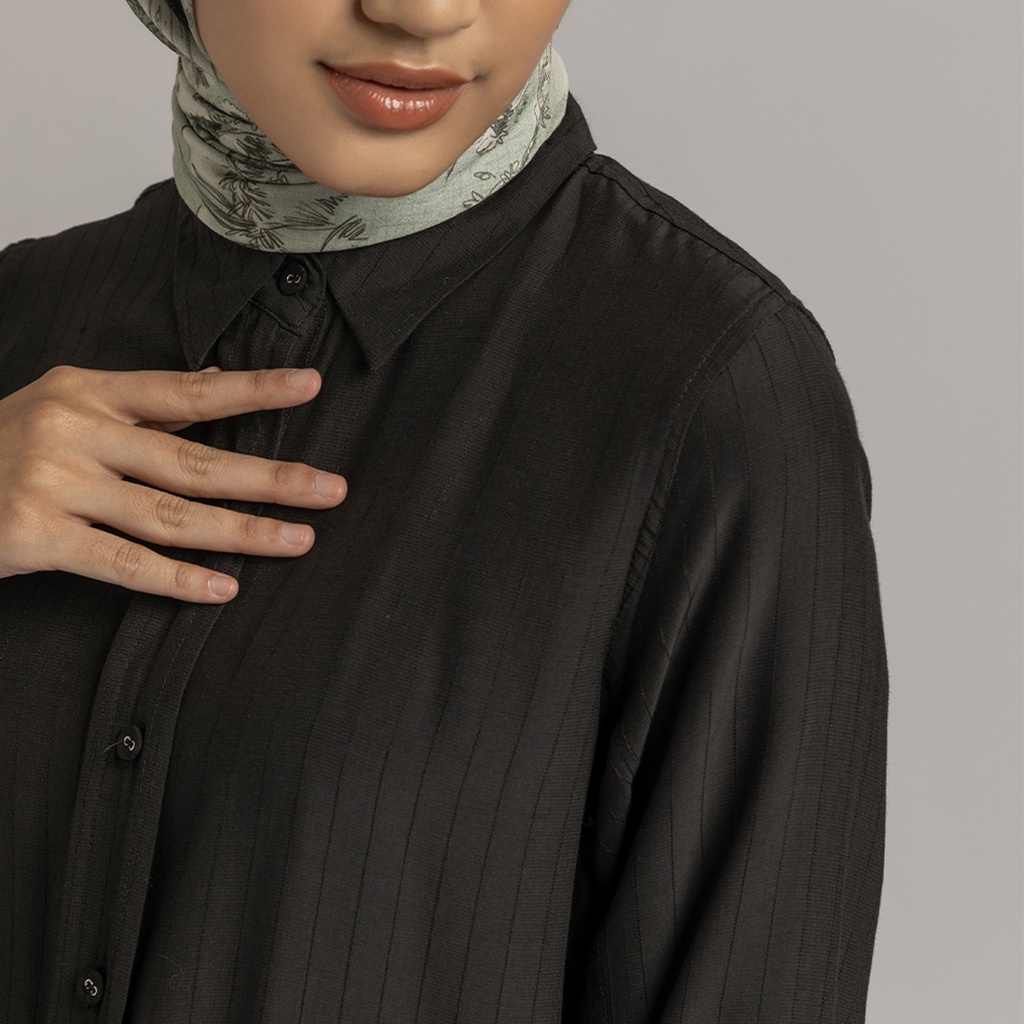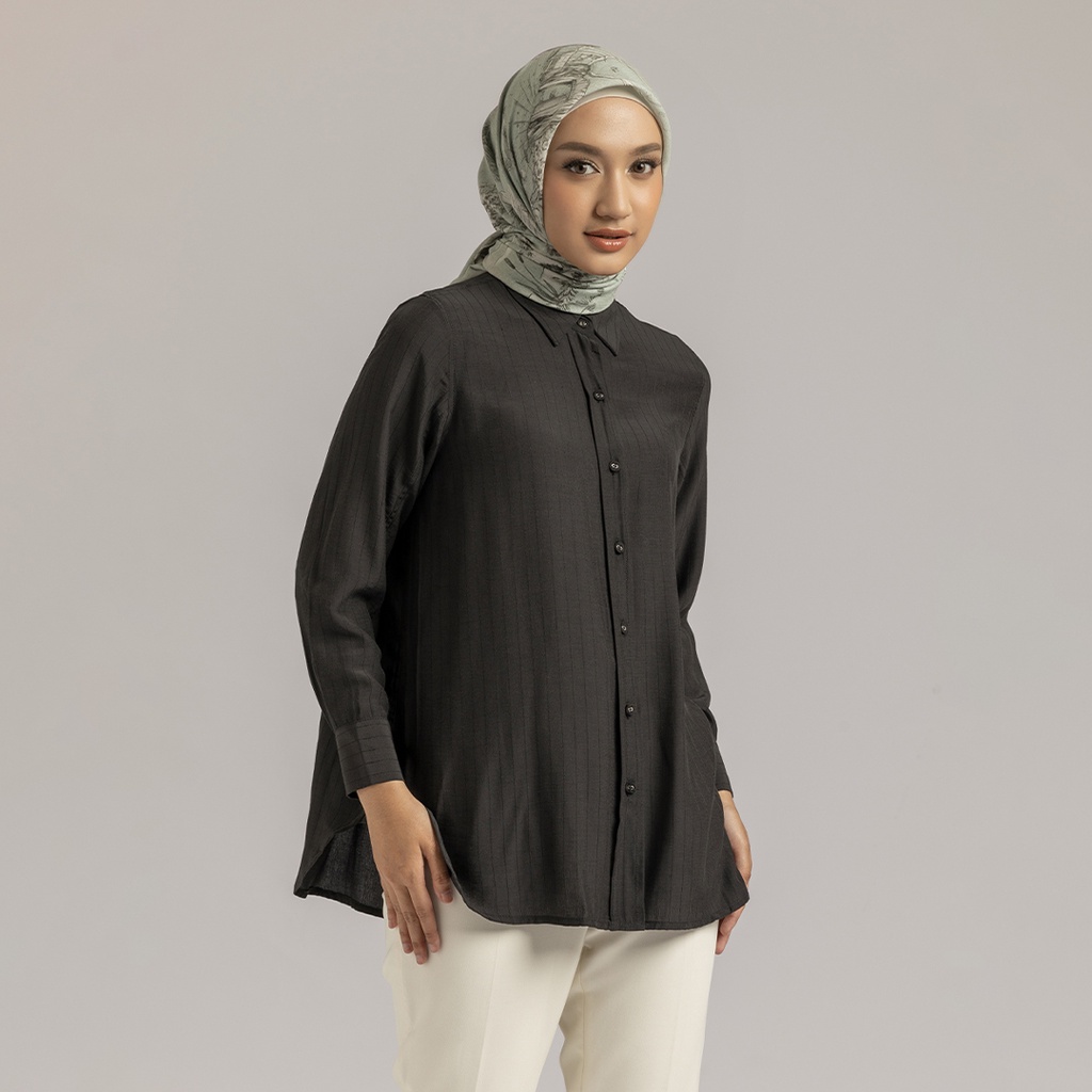 Kemeja berkerah berbahan rayon tencel dengan lengan panjang, dan garis jahit di lengan.