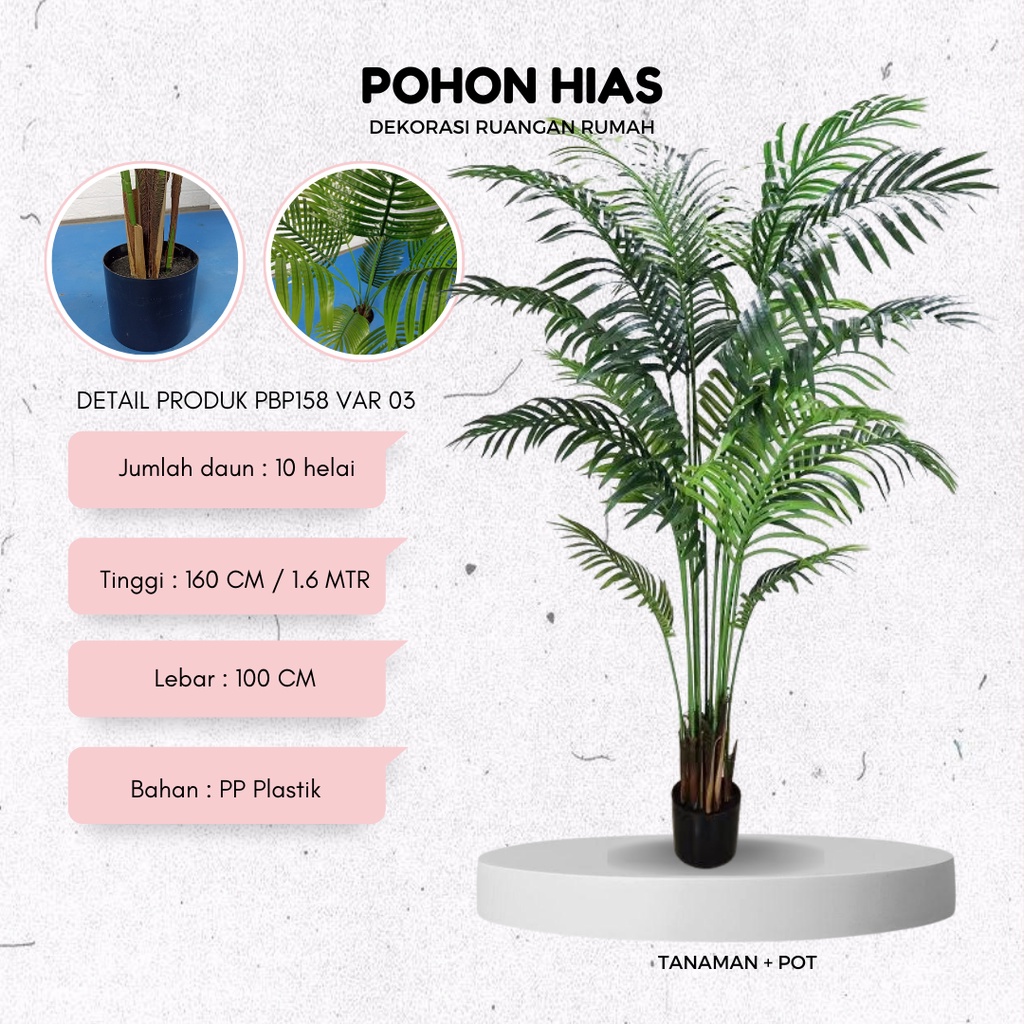 ๐PBP158-03 POHON Harga jual : Rp 649.999 Jumlah daun : 10 helai Tinggi : 160 CM / 1.6 MTR Lebar : 100 CM Bahan : PP Plastik Berat : 2.85 kg