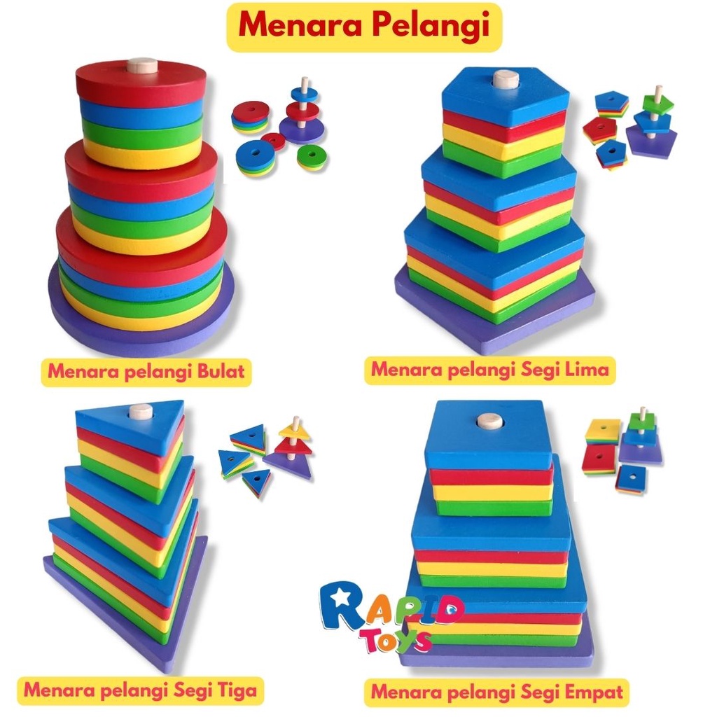 Manfaat Bermain: Belajar mengenal bentuk dan warna, identifikasi dengan ukuran yang membesar di setiap bentuknya. Selain itu membantu anak melatih kesabaran serta motorik halusnya.