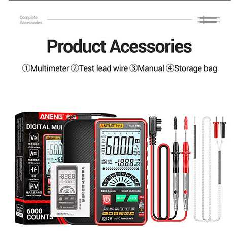 1 x ANENG Digital Multimeter Voice Broadcast Voltage Tester 6000 Count - 616 1 x Pasang Kabel Tes 1 x Pasang Probe Suhu 1 x Tas Penyimpanan 1 x Panduan Penggunaan