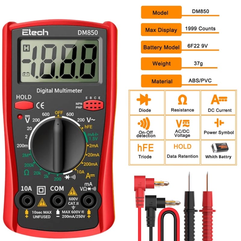 Spesifikasi : Material :Bodi: ABS Case: Karet Dimensi :70 x 140 x 30 mm Ukuran LCD: 45 x 19 mm Lain-lain :Tampilan maks: 1999 Indikasi baterai rendah: Ya Tes dioda: Ya Tes transistor: Ya Tes buzzer kontinuitas: Ya Output gelombang persegi: Ya Tipe Baterai: 1 x 9 V 6F22 (Baterai Tidak Termasuk)