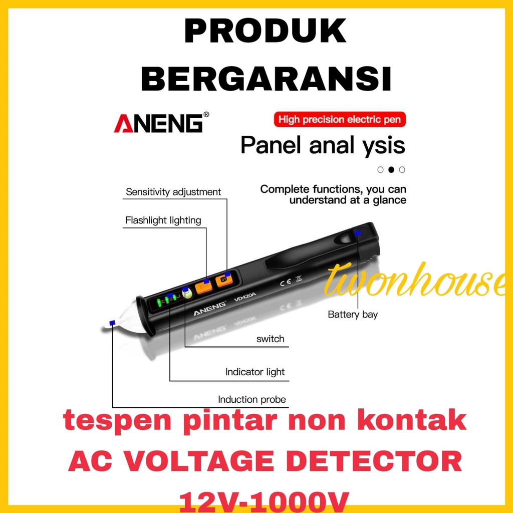 townhouse Informasi Produk ANENG Tester Non Contact AC Voltage Alert Detector 12 - 1000 V - VD802 Pen AC voltage detector berfungsi untuk mengecek jaringan listrik mengalir dalam suatu kabel tanpa perlu menyentuh kabel tersebut. Cukup praktis digunakan untuk mengetahui kabel yang rusak. Terbuat dari bahan plastik yang ringan dan tidak menghantarkan listrik untuk menjamin keamanan saat sedang mengoperasikan alat ini. Fitur Akurat Pengecekan dilakukan dengan mendekatkan detektor ke sumber listrik yang ingin dicek. Sangat aman digunakan karena tidak menyentuh sumber listrik sama sekali. Tampilan LED Terdapat indikator yang akan memberitahukan tegangan sensitivitas rendah dan sensitivitas tinggi. Alat ini akan mati otomatis jika tidak terdeteksi aliran listrik selama 5 menit. Anti Kesetrum Bodi detektor menggunakan bahan plastik yang ringan dan tidak menghantarkan listrik untuk menjamin keamanan saat sedang mengoperasikan alat ini. Mudah Digunakan Sangat praktis digunakan untuk mengetes kabel AC, circuit breaker, stop kontak, junction box, sekering, dan lain-lain. Mudah Dibawa Memiliki bentuk seperti pena dan berukuran kecil untuk memudahkan Anda membawa AC Voltage Tester ini. Kelengkapan Produk Rincian yang Anda dapatkan untuk pembelian produk ini: • 1 x ANENG Tester Non Contact AC Voltage Alert Detector 12 - 1000 V - VD802 • 2 x Baterai AAA 1.5 V • 1 x Panduan Penggunaan Spesifikasi ANENG Tester Non Contact AC Voltage Alert Detector 12 - 1000 V - VD802 Tipe Baterai Baterai: 2 x AAA 1.5 V Material ABS Dimensi 156 x 26.3 x 23.7 mm Lain-lain Suhu Operasi: 0 - 40 Derajat Lampu Senter: Ya Mode alarm: Suara dan Cahaya Sensitivitas NCV: Tinggi, Sedang, Rendah Rentang Pengukuran: 12 ~ 1000 V