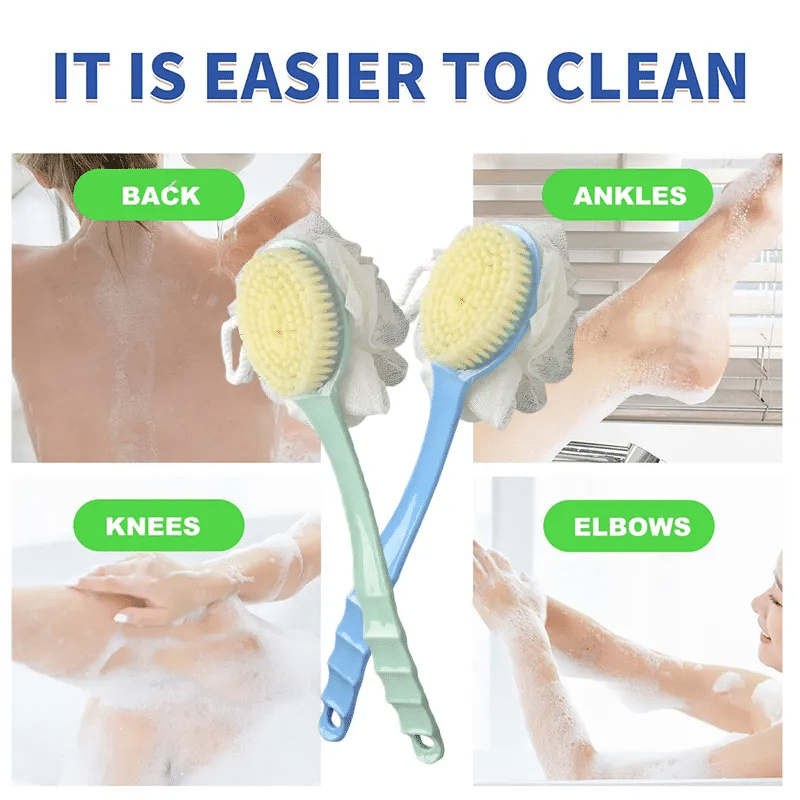 Tongkat mandi dengan gagang panjang dilengkapi spon dan bulu sikat yang lembut yang tidak akan merusak/melukai kulit. Dapat membantu membersihkan bagian tubuh yang sulit dijangkau seperti punggung, selain itu bagus untuk pengelupasan kulit mati dan memijat kulit Anda sehingga kulit lebih terasa bersih. Terdapat tali gantungan dan lubang pada bagian ujung gagang, untuk menggantung tongkat menghemat ruang penyimpanan.