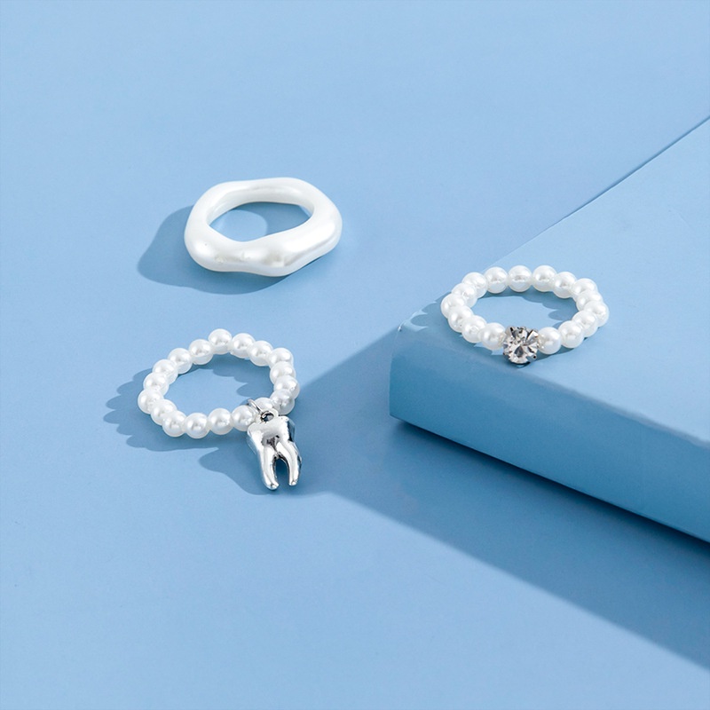Detail Angin Lembut Ins Minoritas Manik-Manik Cincin Perempuan Indah Cahaya Mewah Fashion Mutiara Imitasi Elastis Cincin Gigi Cincin Set