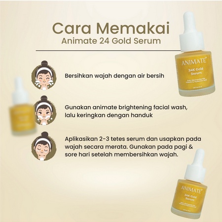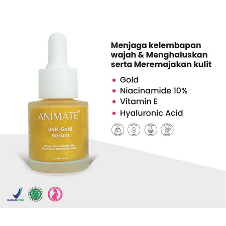Diformulasikan secara khusus dengan menggunakan bahan aktif seperti Gold 24K, Niacinamide 10%, Vitamin E, Hyaluronic Acid, dan Allantoin yang efektif untuk mencerahkan wajah, membuat wajah tampak lebih glowing, menjaga kelembapan wajah, dan menghaluskan serta meremajakan kulit. Animate 24K Gold Serum aman digunakan untuk semua jenis kulit, ibu hamil dan menyusui karena sudah BPOM, Halal, dan teruji secara dermatologis.