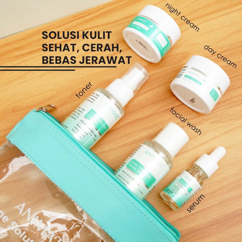 Cara pemakaian : 1. Bersihkan kulit wajah dengan Animate Acne Solution Facial Wash pagi dan malam hari 2. Gunakan Toner dengan Tissue atau di Tap Tap saja untuk Animate Acne Solution Toner secukupnya saat pagi dan malam hari 3. Gunakan Serum Animate Acne Solution Serum 2-3 tetes saja saat pagi dan malam hari 4. Gunakan Day cream untuk pagi hari dan night cream untuk malam hari .