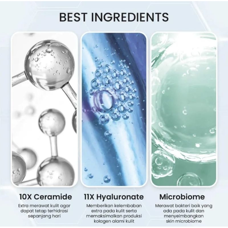 10X Ceramide Adalah bahan aktif dengan 10 tipe ceramide yang bekerja pada tiap lapisan kulit dengan mengisi lipid sesuai kebutuhan kulit, sehingga dapat merawat kulit agar kulit dapat tetap terhidrasi sepanjang hari. 11X Hyaluronate Adalah bahan aktif dengan 11 tipe hyaluronate yang dapat bekerja secara maksimal dengan manfaat bahan pada tiap lapisan kulit yang berbeda-beda. Proses penyerapan bahan juga bekerja tiap tipe nya untuk hasil lebih maksimal dan merata pada seluruh kulit Microbiome Adalah bahan aktif yang dapat merawat microbiota / mikroba baik pada kulit, dengan memberi dan mengembangkan bakteri baik agar dapat lebih seimbang untuk mengurangi infeksi, jerawat, hingga penyakit kulit seperti eksim, rosacea hingga risiko kanker kulit yang terkait dengan paparan sinar uv. Manfaat yang dapat dirasakan secara langsung adalah dapat mengurangi bakteri cutibacterium acnes (salah satu bakteri penyebab jerawat), membantu membunuh bakteri patogen seperti staphylococcus aureus (bakteri yang banyak ditemukan pada permukaan kulit).