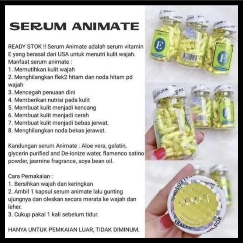 Merupakan perawatan vitamin wajah yang diformulasikan khusus untuk merawat wajah dengan bahan ekstra herbal yang ampuh untuk menjaga kulit wajah dari kekeringan, flek, kekusaman, serta noda bekas jerawat. Animate merupakan softgel yang didalamnya terdapat cairan yang bisa anda oleskan secara merata pada bagian wajah hingga menyeluruh. dengan bahan aktifnya Animate mengandung ; Aloevera dan Vitamin E yang mampu untuk memberikan kelembaban kulit, sekaligus menjaga kulit, agar tidah mudah berkerut dan flek/komedo diwajah.