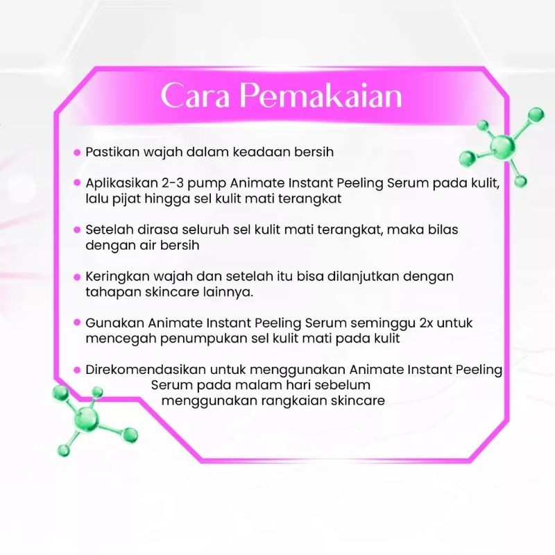 Cara Pemakaian : Pastikan wajah dalam keadaan bersih Aplikasikan 2-3 pump Animate Instant Peeling Serum pada kulit, lalu pijat hingga sel kulit mati terangkat. Setelah dirasa seluruh sel kulit mati terangkat, maka bilas dengan air bersih Keringkan wajah dan setelah itu bisa dilanjutkan dengan tahapan skincare lainnya. Gunakan Animate Instant Peeling Serum seminggu 2x untuk mencegah penumpukan sel kulit mati pad kulit Direkomendasikan untuk menggunakan Animate Instant Peeling Serum pada malam hari sebelum menggunakan rangkaian skincare Setelah menggunakan Animate Instant Peeling Serum pada malam hari, maka pagi hari wajib menggunakan produk yang mengandung UV Filter seperti sunscreen dan day cream untuk melindungi kulit dari paparan langsung akibat pengelupasan sel kulit mati sebelumnya.