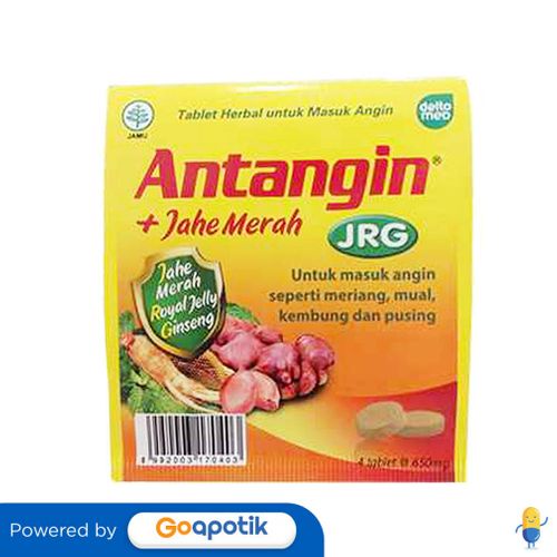 Deskripsi : Antangin JRG merupakan singkatan dari komposisinya yaitu Jahe, Royal, dan Ginseng. Berfungsi untuk meningkatkan stamina, sistem imun, hingga meredakan gejala masuk angin seperti sakit kepala yang disertai pegal. | Komposisi : Tiap tablet mengandung ekstrak jahe, royal jelly, dan ginseng. | Dosis : Konsumsi sesuai usia dan kondisi kesehatan: Dewasa: - Mengobati masuk angin: 2 tablet 3 x sehari. Bila perlu, minum 4 tablet, saat pertama kali. - Mabuk perjalanan: 2-4 tablet sebelum perjalanan jauh. - Menjaga kondisi tubuh: 2 tablet 2 x sehari, konsu | Indikasi : Untuk meredakan gejala masuk angin, meningkatkan stamina, dan sebagai pemeliharaan kesehatan tubuh. | Perhatian Khusus : - | Kemasan : Strip, @4 tablet | NIE : TR082576241