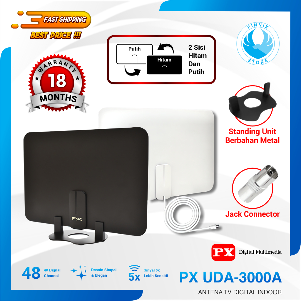 Antena Digital Indoor UDA-3000A adalah antena terbaru yang memiliki 2 sisi desain warna hitam dan putih. Antena ini cocok untuk diletakkan disamping TV (standing unit) dan ditempel pada dinding. Antena TV Digital PX ini dapat digunakan di semua tipe televisi (Smart TV, Plasma TV, LED, LCD, TV Tabung). Mampu mendapatkan siaran digital dan analog.