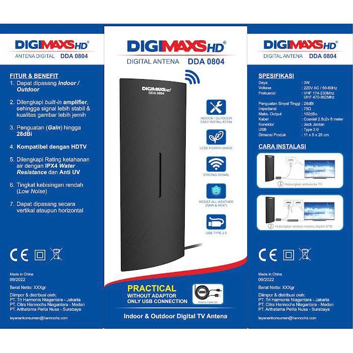 Antena TV DIgital 2 in 1 dapat digunakan untuk fungsi indoor dan outdoor Antena digimax memiliki pemasangan yang sangat mudah, dilengkapi dengan kabel USB sehingga anda tidak perlu menggunakan adaptor untuk powernya, cukup colokkan kabel USB pada TV maka power akan otomatis menyala